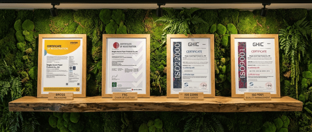 专注品质与可持续发展,公司已获得 FSC、BPI、ISO、SGS、FDA、BSCI 及 BRCS 多项权威认证